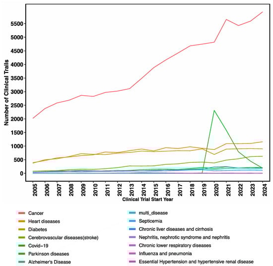 Data analysis of clinical trials with start dates from 2005 to 2024 annotated to disease or conditions revealed a consistent focus on cancer-related trials in the last two decades, reflecting ongoing efforts to develop new treatments for this complex disease. Additionally, there was a notable surge in the COVID-19 trials during the last COVID-19 pandemic, underscoring the impact of global health emergencies on clinical research priorities (Figure 6).