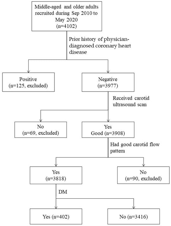The study subjects were recruited from an ongoing community-based cohort study [29,30]. The eligibility for inclusion were those who aged 40–74 years and had resided in the studied communities for at least six months [29,30]. We used three measures to promote participation. The first was that we obtained the addresses of households with eligible subject(s) from the district offices of household registration. The second was that we sent highly informative invitation letters to eligible households. The invitation letters described the objective, protocols, inclusion and exclusion criteria, and main measurement methods of the study. The last was that, to increase accessibility, we set up recruitment sites in local public places. A total of 4102 eligible residents voluntarily provided informed consent and were enrolled from September 2010 to May 2020. Enrollees completed a structured questionnaire and provided a fasting blood sample for biochemical measurement. There were 125 enrollees who had a positive history of coronary heart disease (CHD) and were excluded. Additionally, 69 subjects who did not receive an ultrasonographic scan and 90 subjects who lacked a proper blood flow pattern were excluded. Consequently, in this community-based case–control study, there were 3818 middle-aged or older subjects, and 402 (10.5%) of them fitted the definition of DM (Figure 1).