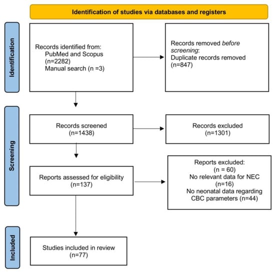 APA StyleSokou, R., Mantzios, P., Palioura, A. E., Tsantes, A. G., Lianou, A., Piovani, D., Tsante, K. A., Lampropoulou, K., Iacovidou, N., & Bonovas, S. (2025). Diagnostic and Prognostic Value of Hematological Parameters in Necrotizing Enterocolitis: A Systematic Review. Journal of Clinical Medicine, 14(7), 2530. https://doi.org/10.3390/jcm14072530