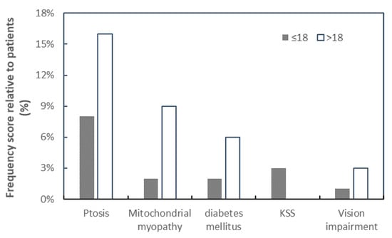 The frequently observed clinical manifestation was ptosis (n = 20; 55.6%) followed by mitochondrial myopathy in (n = 9; 25%), diabetes mellitus type II (n = 6; 16.7%), and cardiac disorders in (n = 5; 13.9%). Detailed clinical data of patients are listed in Table 1. The thirty-six index patients in this study were grouped into two age groups: ≤18 years and >18 years (Table 2). The subsequent clinical symptoms were more frequently reported in patients older than 18 years, harboring the common deletion (Figure 1). Moreover, based on clinical characteristics, the patients were further divided into two sub-groups: patients with pure CPEO (n = 9) and patients harboring CPEO along with other symptoms (CPEO plus) (n = 27) (Table 2). It is interesting to note that among patients with CPEO plus, seven were harboring cardiac-related diseases (ischemic heart disease, arrhythmia, and bradycardia), together with muscle weakness. Endocrine-related disorders revealed among the index patients include hypercholesterolemia, lactose fructose intolerance, hyperlipidemia, and hypothyroidism.