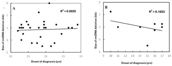Correlation between patients’ onset of diagnosis and size of mtDNA deletion in (A) the total set for age group > 18 years and (B) datasets for age group ≤ 18 years. R2 indicates the strength of a linear relationship between the two parameters. No significant differences were found among both patients’ age groups, with the same frequency range. However, there were different coefficient correlations for each group.
