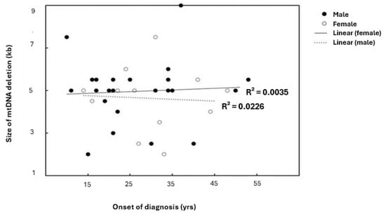 Linear correlation between patients’ onset of diagnosis and size of mtDNA deletion relative to gender. R2 indicates the strength of a linear relationship between the two parameters. Although there are no significant differences found among genders, with the same frequency range; the scatterplot and linear regression line showed the existence of variable coefficient correlations.