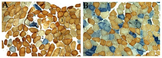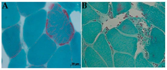 Histological diagnostics that are commonly associated with mtDNA disease using muscle biopsies are the detection of ragged-red fibers (RRF) by Gomori trichrome that stains positive succinate dehydrogenase (SDH)m and negative to cytochrome-c-oxidase (COX) [20]. On the skeletal muscles of patients with mitochondrial myopathy, these stains could present a low level or absence of COX activity [21]. Zeviani and other researchers, in 1988, did a study on patients with KSS and observed the accumulation of abnormal mitochondria in the subsarcolemmal membrane of the mitochondria, which resulted in scattered fibers called RRFs [22]. The abnormal accumulation of mitochondria around the edge of muscle fibers (RRFs) is proposed to be an important histological biomarker of mtDNA disease, and a large number of blue (COX-negative, SDH-positive) muscle fibers is a diagnostic feature of mitochondrial myopathy caused by mtDNA mutations.