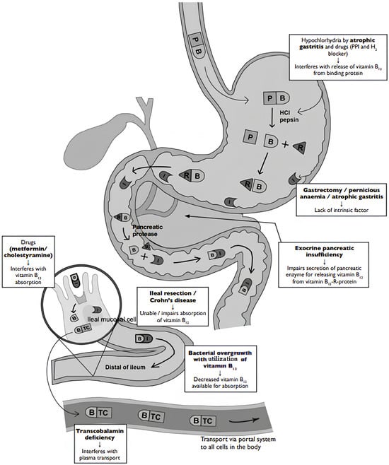- Guéant, J.L.; Guéant-Rodriguez, R.M.; Alpers, D.H. Chapter Nine—Vitamin B12 absorption and malabsorption. In Vitamins and Hormones; Litwack, G., Ed.; Academic Press: Cambridge, MA, USA, 2022; Volume 119, pp. 241–274. Available online: https://www.sciencedirect.com/science/article/pii/S0083672922000164 (accessed on 27 March 2025).