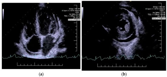 Echocardiography: left ventricular hypertrophy, impaired relaxation-type 1 diastolic dysfunction, (a) left ventricular ejection fraction of 50%, (b) circumferential pericardial effusion (9–11 mm).
