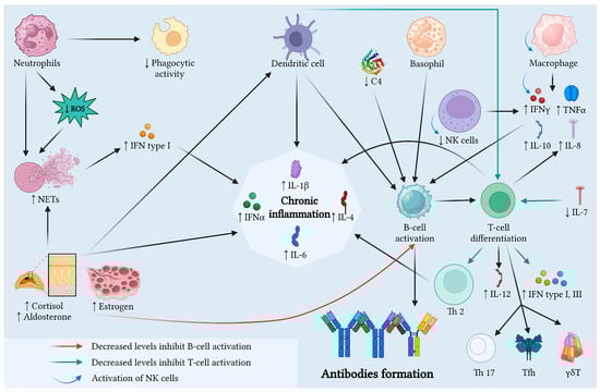 Sex hormones progesterone and androgen have a protective role against SLE, and estrogen contributes to SLE development by interfering with the immune system. Estrogen increases the production of IFN-α and contributes to the survival of autoreactive B cells and the production of IgG antibodies against ds-DNA. High levels of cortisol lead to Th2 cell activation and NETs formation. Progesterone reduces the production of IFN-α, contributes to the production of IgM antibodies, and decreases levels of IgG autoantibodies, and prevents formation of NETs. Androgens decrease the IgG autoantibody production and increase the TGF-β levels and NETosis [41,68,69].