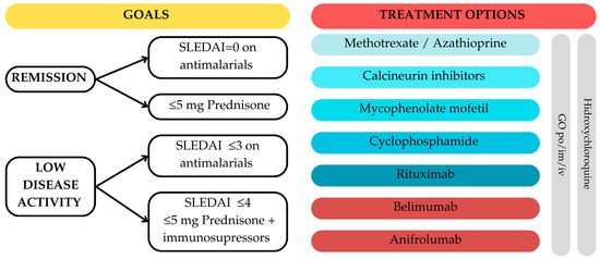 The management goal in patients with SLE is remission or low disease activity. Treatment options are listed in Figure 4.