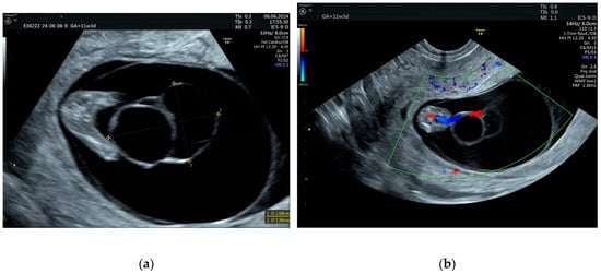- Roxana, B.; Radoi, V.; Bohiltea, L. Umbilical cord cysts in first trimester pregnancy. Ultrasound Obstet. Gynecol. 2014, 44 (Suppl. S1), 181–369. [Google Scholar]