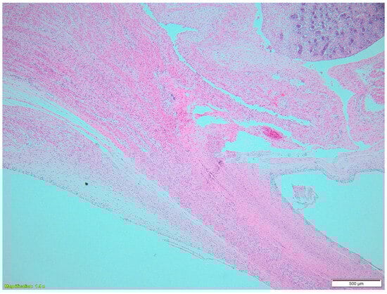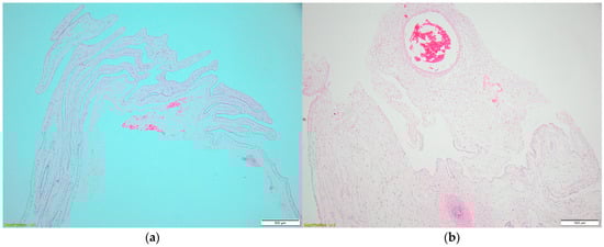 While most studies [,] do not report on histology, the study of Sepulveda et al. [] reported on 13 cases of umbilical cord pseudocysts, of which histological examination was available in 9 cases. The authors propose an ultrasound criterion for differentiating cysts from pseudocysts: at color flow examination, the vessels are widely split apart in true cysts, whereas in pseudocysts the vessels are pushed away together by the mass. In Sepulveda’s study [], chromosomal anomalies were present in seven cases (7/13, trisomy 18—five cases, trisomy 13—one case, trisomy 21—one case), severe structural defects in two cases (ending with fetal death), omphalocele in two cases (successful surgical repair) and two normal neonates. It is reasonable to conclude that pseudocysts are associated with chromosomal anomalies, whereas a similar correlation could not be proven for true cysts.