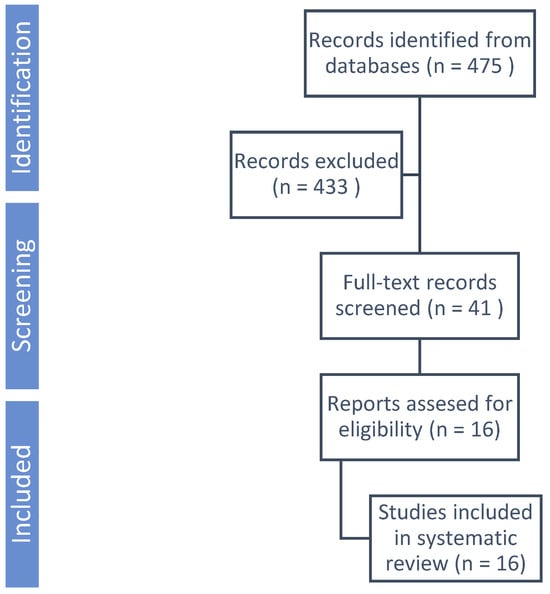 The literature search of PubMed, Web of Science and EMBASE databases initially retrieved 475 potentially relevant studies. After evaluation of the title or abstract, 433 were excluded. The remaining 41 studies were reviewed in full text (Figure 5). Overall, 16 studies were included [,,,,,,,,,,,,,,,]. The findings from these studies provide valuable insights into the prevalence, diagnosis and management of umbilical cord anomalies, emphasizing the importance of early detection and appropriate clinical intervention.