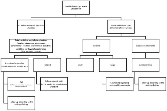 There is no consensus regarding the management of umbilical cord cysts. As a result of the literature review, we proposed the subsequent flowchart for following up on the umbilical cysts.