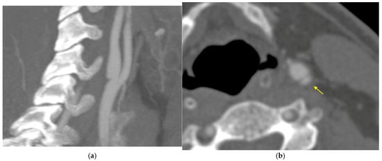 - Takahashi, T.; Yanaka, K.; Aiyama, H.; Saura, M.; Kajita, M.; Takahashi, N.; Marushima, A.; Matsumaru, Y.; Ishikawa, E. Spontaneous asymptomatic common carotid artery dissection resembling a carotid web: Illustrative case. J. Neurosurg. Case Lessons 2024, 8, CASE24344. [Google Scholar] [CrossRef] [PubMed]