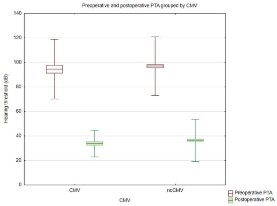 Mean preoperative hearing thresholds were 94.54 dB (SD = 12.16) in the CMV group and 97.04 dB (SD = 11.98) in the control group. At the most recent postoperative evaluation, mean thresholds improved to 33.83 dB (SD = 5.44) and 36.42 dB (SD = 8.59), respectively (Figure 1). No statistically significant differences were observed between the groups.