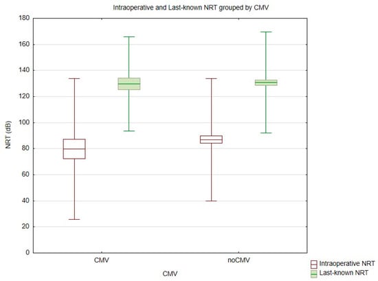Mean intraoperative NRT values were 79.74 (SD = 27.05) in the CMV group and 86.90 (SD = 23.50) in the non-CMV group. Final NRT values were 129.77 (SD = 18.11) and 130.76 (SD = 19.43), respectively (Figure 2).