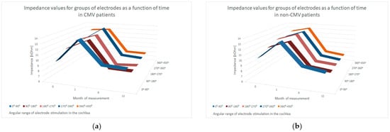 Impedance values for groups of electrodes as a function of time. (a) cCMV patients, (b) non-cCMV patients.