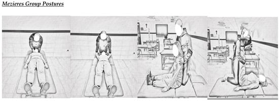- Alfonso-Mora, M.L.; Guerra-Balic, M.; Sánchez-Martín, R.; Pedraza-Gómez, Z.; Ramírez-Moreno, J.; Castellanos-Garrido, A.L.; Zambrano-Cristancho, L.K.; Rengifo Varona, M.L. Mézières Method as a practice of embodiment in patients with low back pain: A mixed study. Ann. Med. 2023, 55, 2265379. [Google Scholar] [CrossRef] [PubMed]