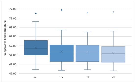 Course of Kmax at BL, Y7, Y9, Y12. Mean Kmax (represented by X) and the spread of minimum and maximum values are displayed. BL: baseline; Y7: year 7 postoperative, Y9: year 9 postoperative; Y12: year 12 postoperative.