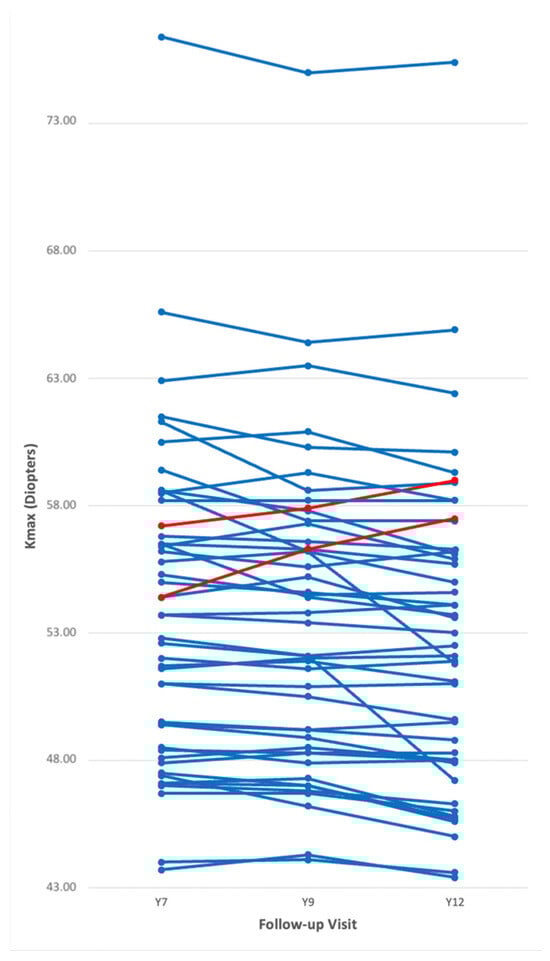 In this patient cohort, two eyes (4.3%) exhibited suspected disease progression in terms of an increase in Kmax of ≥1 dpt between Y7 and Y12. Kmax at the baseline of these eyes was 52.90 dpt and 56.20 dpt compared to 55.97 dpt (SD: 6.16 dpt, maximum: 74.60 dpt, minimum: 44.10 dpt) in non-progressive eyes. The threshold an increase of ≥1 dpt in Kmax was chosen in accordance with previously reported long-term results after CXL [13,22,23] for best possible comparability.