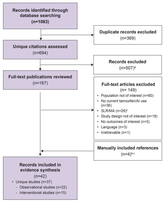 PRISMA flow diagram. AI, aromatase inhibitor; MA, meta-analysis; SLR, systematic literature review. a Records did not meet inclusion criteria. b The reference lists of SLRs were manually searched for any additional studies; three studies were identified for inclusion. c One additional study was manually identified for inclusion from a health technology assessment website.