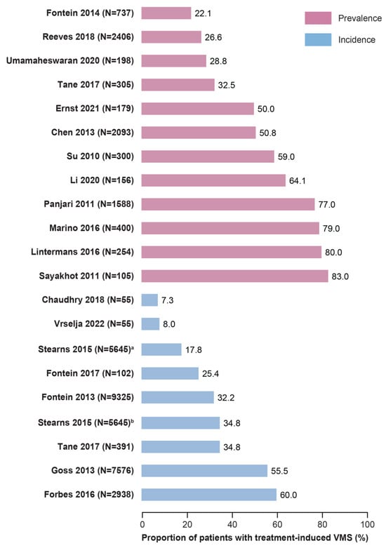 The prevalence and/or incidence of VMSs was reported in six interventional studies [38,39,45,46,47,49,50]. The incidence of VMSs ranged from 17.8% after 6 months of treatment to 34.8% after 12 months, both reported in the same study of 5645 individuals treated with exemestane or anastrozole [46].