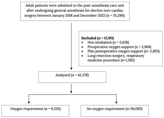Patients 18 years and older undergoing elective non-cardiac surgery under general anesthesia who were admitted to the PACU from January 2018 to December 2022 were included. Exclusion criteria included patients with missing data (no imputation methods applied), those undergoing pulmonary surgery (e.g., thoracotomy, lobectomy, pneumonectomy), and respiratory medicine procedures (e.g., endobronchial ultrasound, bronchial stent insertion, therapeutic bronchodilation), as postoperative oxygen requirements in these cases are influenced primarily by underlying pulmonary conditions rather than general perioperative risks. Additionally, patients requiring preoperative oxygen therapy, those with planned postoperative oxygen use, and those admitted to the intensive care unit (ICU) postoperatively were excluded (Figure 1).