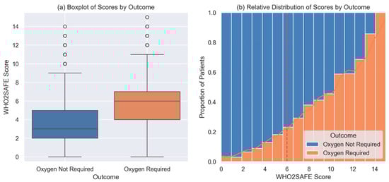 A cutoff score of 6 provided a balanced trade-off between sensitivity (51%), specificity (80%), and overall accuracy (76%), as illustrated in both the performance curve (Figure 4a) and the corresponding metric table (Figure 4b). The discriminative capacity of the WHO2SAFE score was further visualized using boxplots and stacked bar plots (Figure 5). Patients who required postoperative oxygen had higher median scores and broader interquartile ranges (Figure 5a). The distribution plot (Figure 5b) showed that the proportion of oxygen-requiring patients increased progressively with higher WHO2SAFE scores. A web-based calculator has been developed for easy application in clinical settings and is available at https://app.calconic.com/public/calculator/67bddafeef41c8002aebf33b?layouts=true (accessed on 9 March 2025).