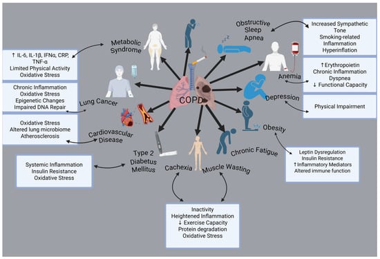 The clinical signs and pathological processes are not limited to airway remodeling and pulmonary inflammation. One of the main characteristics of COPD is that comorbidities have a big impact on an individual’s prognosis. Cardiovascular diseases, osteoporosis, muscle weakness, metabolic and endocrinological disorders, anxiety disorders, depression, and cancer are among the most prevalent health conditions associated with these factors [19] (Figure 1).