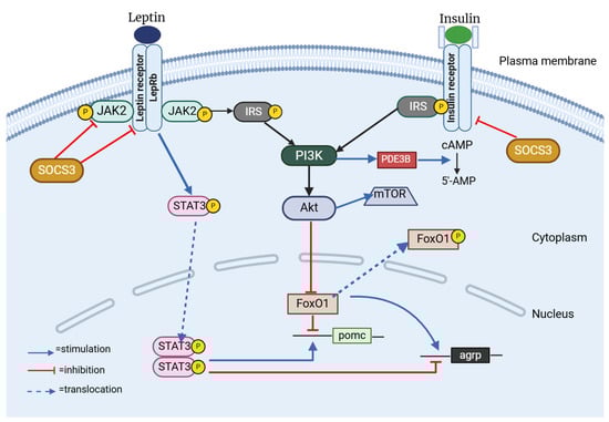 In the dynamic world of hypothalamic neurons, leptin and insulin are instrumental in initiating important signaling pathways. Leptin activates the JAK–STAT3 pathway, while insulin engages the PI3K–Akt pathway [63] (Figure 3). Despite mediating different but similar signaling pathways, leptin and insulin are both known to be important modulators of adiposity and energy homeostasis. Studies have indicated that obesity, insulin resistance, hyperphagia, and hyperleptinemia observed in murine models are correlated with the disruption of insulin receptors (IRs) within the central nervous system [64]. Anorexigenic effects of these hormones are mediated by CNS-expressed IRs and leptin [65,66,67]. Leptin and insulin are known to enhance the activity of the anorexigenic POMC/CART (cocaine-and amphetamine-related transcript) neurons, while simultaneously exerting an inhibitory effect on the orexigenic NPY/AgRP neurons [67,68]. Recent research has also clarified how leptin and insulin interact with one another. For instance, insulin resistance might alter leptin signaling within a hypothalamic cell line, and leptin resistance could lead to the suppression of insulin signaling [63]. Also, insulin serves a pivotal function in enhancing the activation of STAT3 mediated by leptin, which is a transcription factor of considerable importance within a crucial signaling pathway designed to inhibit the development of obesity [69].