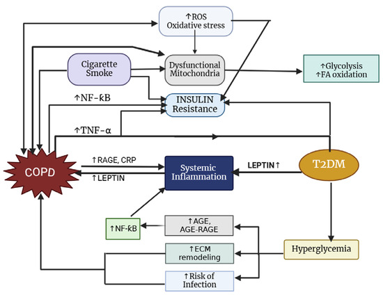 Lung inflammation associated with COPD leads to an elevation in various biomarkers indicative of neutrophilic inflammation (neutrophils, elastase, MMP9, calprotectin, and neutrophils found in bronchoalveolar lavage) along with increased pro-inflammatory cytokines (C-reactive protein, TNF-α, IL-6, IL-1β, and IFNα within peripheral blood) [121]. The persistent increase in these inflammatory molecules leads to mild but ongoing systemic inflammation, which is significant in this scenario. In particular, cytokines such as IL-6, IL-1β, TNF-α, and CRP contribute to the development of insulin resistance [121].