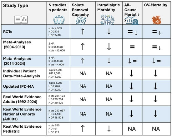 From a clinician’s perspective, this narrative review underscores the superior benefits of high-volume HDF for patients with ESKD. High-volume HDF surpasses high-flux HD in key intermediary outcomes, including the enhanced solute clearance of middle and large MW solutes, the improved control of uremic toxins, and the reduction in inflammation and oxidative stress. More importantly, it translates these improvements into significant clinical and patient-centered benefits. These include a 22–23% improvement in survival rates when a minimum convective dose of 23 L/session is achieved, a slower decline in patient-reported outcomes such as cognitive function and social engagement, and a cost-effective alternative modality to high-flux HD. A graphical summary of the major studies and key outcomes is presented in Figure 1. Such evidence may support a progressive paradigm shift in kidney replacement therapy, making high-volume HDF the preferred option and up to the standard of care for the majority of patients. Additionally, these benefits extend beyond adult patients, showing promising results in pediatric ESKD populations as well. However, while high-volume HDF marks substantial progress, it should not be viewed as a standalone solution. Further initiatives should focus on leveraging HDF as a customizable treatment platform, enabling personalized care that aligns with individual patient needs and regional healthcare policies.