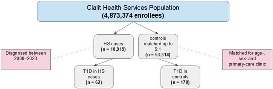 This population-based study was conducted to estimate the likelihood of incident HS developing in patients with T1D. As HS is considered a relatively rare disease (<10% of population), a nested case-control design was chosen in order to detect enough cases (outcome). With this design, the odds ratio (OR) is a good approximation of the hazard ratio (HR) [18]. Data were sourced from Clalit Health Services (CHS), the largest healthcare organization in Israel, with 4,873,374 enrollees as of December 2023. The real-time computerized CHS dataset encompasses comprehensive medical, pharmaceutical, and administrative records. Every encounter within the healthcare system is documented in the patient’s medical record. The database of CHS undergoes continuous updates to ensure a thorough longitudinal perspective on the health of its enrollees, enhancing its value for epidemiological research by minimizing selection and information biases.