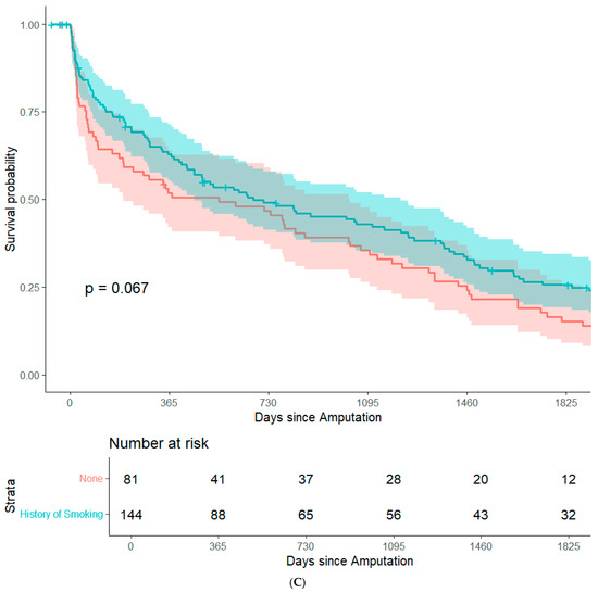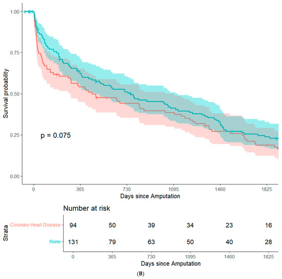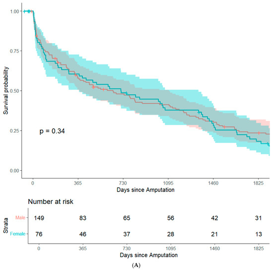 This study was conducted as a retrospective single-center analysis. Patient data were extracted from electronic medical records including demographics, comorbidities, and treatment characteristics. The study included all patients of 18 years or older who underwent major amputation due to microangiopathic disease or PAD between 2012 and 2016. In total, 244 patients met the inclusion criteria. Mortality data were obtained from the Austrian National Death Registry and linked with data extracted at the study center with the most recently available data (cutoff date: 31 December 2023). Censored patients were therefore either alive at this date or lost to follow-up, for example, in cases of relocation to a different country. Plausibility checks were manually conducted on the collected data to ensure accuracy and consistency.