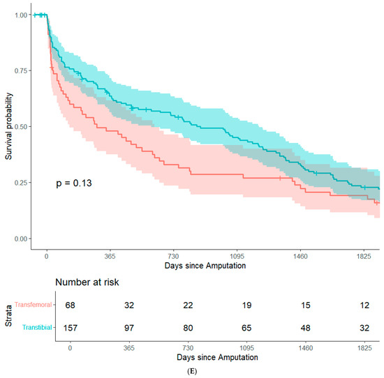 By focusing on data from patients that underwent major amputation between 2012 and 2016, it was feasible to conduct long-term (+5 years) survival analyses while minimizing bias from resulting from right censorship. In summary, 202 patients (82.8%) were recorded in the Austrian National Death Registry. The remaining patients were censored either because they were still alive or because they were lost to follow-up. There were no significant differences in post-operative survival when stratifying the study population based on sex, history of coronary heart disease, history of smoking, surgical re-intervention after amputation, or type of amputation. (Figure 1A–E). Patients with an ASA class of 4 had significantly lower post-operative survival rates than the other patients in the study population (Figure 1F). In an adjusted Cox regression, age at surgery (aHR: 1.03, 95%CI: 1.02–1.05) and ASA class (aHR: 1.61, 95%CI: 1.20–2.15) were both significantly associated with post-operative survival.