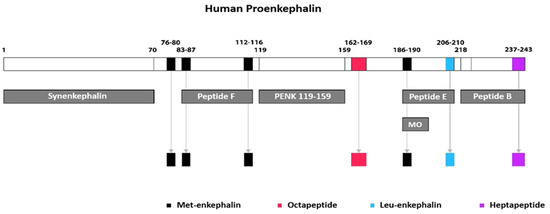 Human proenkephalin peptide processing. The 243-amino-acid-long proenkephalin is cleaved at different sites to yield the intermediate-sized peptides Synenkephalin (1–70), peptide F (83–116), PENK 119–159, peptide E (186–210), and peptide B (218–243), as well as the small-sized biologically active peptides Met5-enkephalin (76–80) and Octapeptide (162–169). Further cleavage of intermediate peptides generates a larger number of active peptides, namely two copies of Met5-enkephalin (83–87) and (112–116) from peptide F; one Met5-enkephalin (186–190) from sequential processing of peptide E into metorphamide (MO); one Leu5-enkephalin (206–210) directly from peptide E; and finally, one heptapeptide (237–243) from peptide B. Collectively, one human proenkephalin molecule gives rise to active enkephalin peptides at a ratio of 4 Met5-enkephalin: 1 Leu5-enkephalin: 1 heptapeptide: 1 octapeptide [3,10,11,12,13,14].