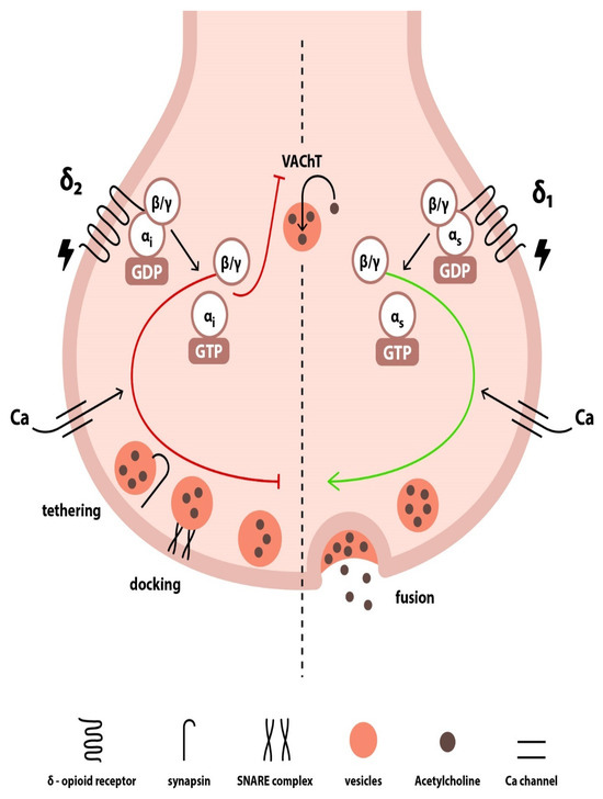 Modulation of presynaptic signaling in cholinergic nerve terminals by enkephalins. Enkephalins modulate presynaptic signaling in cholinergic nerve terminals innervating the sinoatrial node by acting on two functionally different subtypes of δ (delta)-opioid receptors (ORs), namely δ1-ORs and δ2-ORs. These two subtypes of δ-ORs are activated by enkephalins in a concentration-dependent manner, thereby resulting in bimodal effects on acetylcholine (Ach) release [27,29]. Low doses of enkephalins activate the δ1-OR, a stimulatory G protein-coupled receptor (Gs), which augments Ach release and induces vagotonic effects. On the contrary, higher levels of enkephalins activate the δ2-OR, an inhibitory G protein-coupled receptor (Gi), which inhibits Ach release and promotes vagolytic effects [27,28]. δ1-OR activation by enkephalins initially leads to the dissociation of the Gαs subunit from the Gβ/γ heterodimer. In turn, the dissociated Gαs subunit increases the activity of adenylyl cyclase and the production of cyclic adenosine monophosphate (cAMP), while the Gβ/γ subunit promotes calcium (Ca) entry into the nerve terminal (green arrow), thereby enhancing Ach release [38,39]. Concerning δ2-OR activation, the mechanism of action likely involves several pathways. Upon δ2-OR activation, the Gαi subunit reduces adenylyl cyclase activity, while the Gβ/γ subunit inhibits voltage-gated Ca channels (red arrow), through which Ca enters the nerve terminals to activate calcium sensor proteins and trigger the initiation of docking and fusion processes. The net result of decreased Ca influx is attenuated cholinergic transmission due to decreased Ach release in the synaptic cleft [28,31,32]. Moreover, the dissociated Gβ/γ subunit modulates the function of the soluble N-ethylmaleimide-sensitive factor attachment protein receptor (SNARE) complex, which is a protein apparatus embedded on both vesicular and plasma membranes that is actively involved in the docking and fusion of synaptic vesicles and subsequent neurotransmitter exocytosis [32]. The Gβ/γ subunit appears to interact with the SNARE complex mainly through competing with synaptotagmin (a Ca sensor protein that promotes the fusion of the vesicles with the plasma membrane) for binding sites on the SNARE complex, thus resulting in inhibition of Ach exocytosis [31,32,33]. In parallel, it is also possible that δ2-OR activation interferes with the function of synapsin, which has been implicated in the processes of tethering, docking, mobilization, and fusion of the synaptic vesicles. Under resting states, synaptic vesicles are reversibly tethered to the meshwork of the actin cytoskeleton by synapsin, which thereby acts by linking adjacent synaptic vesicles with each other and keeping them clustered and anchored in a distal reserve pool away from the plasma membrane. Apart from its tethering action, synapsin is also involved in the docking, post-docking, and fusion events. Upon phosphorylation of synapsin, synaptic vesicles are mobilized from the reserve pool, dissociate from the cytoskeleton and from each other, and move to the readily releasable pool, close to the synaptic cleft, where they are now free to fuse with the plasma membrane and release their content through exocytosis [34]. Accordingly, following δ2-OR activation, it could be postulated that the δ2-OR-coupled Gi protein inhibits synapsin phosphorylation and the downstream events, eventually resulting in reduced Ach release from the presynaptic cholinergic nerve terminal. Finally, δ2-OR signaling seems to modulate vesicular acetylcholine transporter (VAChT) turnover by inhibiting VAChT, which is a vesicular membrane-bound transporter that facilitates entry and storage of Ach into the synaptic vesicles. Due to VAchT inhibition, Ach cannot move into the synaptic vesicles and thus cannot be secreted in the synaptic cleft [29,35].