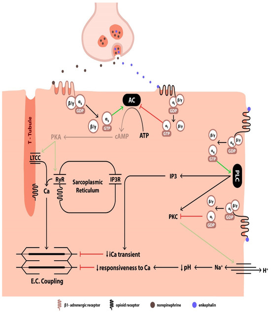 Modulation of opioid receptor-mediated postsynaptic signaling by enkephalins. On the postsynaptic membrane, the activation of the opioid receptor (OR) by enkephalins generates a sympatholytic effect via a cross-talk process between the OR and the beta 1 (b1)-adrenergic receptor (AR) [40]. Normally, upon norepinephrine binding to the b1-AR, a conformational change in the G protein-coupled receptor occurs, which leads to the dissociation of the Gαs subunit from the Gβ/γ subunit. This results in the sequential activation (green arrow) of adenylyl cyclase (AC) and protein kinase A (PKA), which in turn triggers the opening of both L-type calcium channels (LTCC) on the T-tubules and the ryanodine receptors (RyR) on the membrane of the sarcoplasmic reticulum (SR) [30,43]. Accordingly, both the amplification of calcium (Ca) influx through LTCC and the augmented release of Ca from the SR through RyR result in the increase in intracellular Ca levels and the subsequent stimulation of the excitation–contraction coupling [43]. During adrenergic stimulation, enkephalins are co-released with norepinephrine in the synaptic cleft and bind to the OR. Subsequent OR activation leads to the dissociation of the inhibitory Gαi subunit from the trimeric G protein. Thereafter, the Gαi subunit inhibits (red arrow) adenylyl cyclase and results in the reduction of all downstream messengers, thereby blunting the positive inotropic effects mediated by the b1-AR signaling [30,40,41]. It should additionally be noted that, apart from the postsynaptic membrane, ORs are also present in the T-tubule (in proximity with LTCC), as well as in the SR (colocalized with isoform 2 RyR) [5,6]. In parallel, OR activation appears to further inhibit excitation–contraction coupling via a non-b1-AR cross-talk manner, whereby enkephalins stimulate sarcolemmal δ-ORs of the Gq family [44]. In this case, dissociation of the Gaq subunit leads to the activation of phospholipase C (PLC) with subsequent synthesis of diacylglycerol (DAG) and inositol 1,4,5-trisphosphate (IP3). In turn, IP3 activates the IP3 receptor on the SR membrane and promotes Ca release from the SR [30,44]. Although initially, an increase in cytosolic Ca favors excitation–contraction coupling, it appears that enkephalins eventually deplete SR Ca stores and lead to a reduction in cytosolic Ca transient [44]. Additionally, DAG normally activates protein kinase C (PKC), which stimulates sodium–hydrogen (Na+/H+) antiporter to move Na+ inside the cell in exchange for H+. However, it seems that another alternative Gi OR-mediated pathway exists, which leads to the inhibition of PKC and the subsequent inhibition of Na+/H+ exchanger, thereby resulting in the reduction of intracellular pH and consequently in the decreased responsiveness of myosin filaments to Ca [45,46].