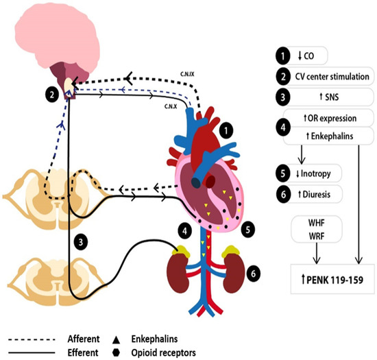 Nevertheless, a larger body of evidence concerning the effects of active EOPs on cardiovascular function reveals that enkephalin peptides and opioid receptors (ORs) are expressed in both failing and non-failing myocardial tissue [5,6,7]. It is therefore not surprising that OR agonism or blockade may generate certain cardiovascular responses [8]. This review will primarily unravel basic aspects regarding the production and distribution of EOPs, the cardiovascular and renal effects of the enkephalinergic system under physiological conditions, and the upregulation of enkephalins in HF. By bridging the gap between pathophysiological mechanisms and clinical implications, this review aims to provide a deeper understanding of the association between plasma PENK119–159 levels and clinical outcomes in patients with HF.