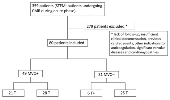 Study flow chart. MVO = microvascular obstruction; T = LV thrombosis; STEMI = ST-segment elevation myocardial infarction; CMR = cardiac magnetic resonance.