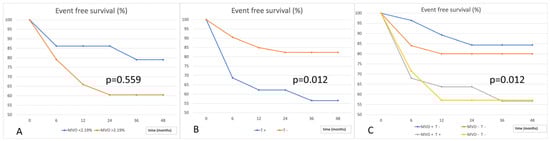 We evaluated the outcome in terms of event-free survival according to the presence of MVO. Kaplan–Meier analysis did not reveal a significant correlation (p = 0.727). Considering the median value of MVO (expressed as % of LV mass) equal to 2.19%, to evaluate the relationship with the extent of MVO, Kaplan–Meier curves did not significantly differ (p = 0.559). With regards to the event-free survival, we found that intraventricular thrombosis was associated with a worse prognosis (p = 0.012). Combining the extent of MVO and LV thrombosis treated with anticoagulation therapy, Kaplan–Meier curves showed a clear distinction in terms of outcome depending on the presence of LV thrombosis (p = 0.012) (Figure 3).