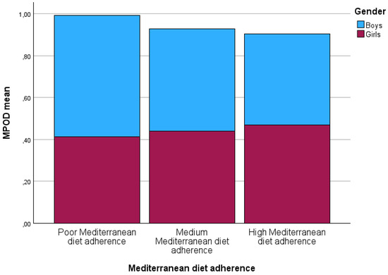 When the KIDMED questionnaires were analyzed, the mean score obtained was 7.19 ± 1.85 (range: between 3 points for minimum and 11 points for maximum); therefore, the average participant had a “medium” Mediterranean diet adherence. Nevertheless, the children were classified by their Mediterranean diet adherence (Figure 1). Only four children manifested “poor” Mediterranean diet adherence with a mean MPOD of 0.45 ± 0.95. Forty-two children showed medium and high Mediterranean diet adherence in each group, although when Kruskal–Wallis with Bonferroni’s post hoc adjustments were applied to determine differences among groups, no statistically significant differences were found in MPOD (p = 0.38), or between poor Mediterranean diet adherence and medium or high Mediterranean diet adherence (p = 0.84 and p = 0.86, respectively).