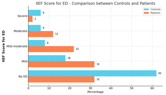 Distribution of IIEF scores by group, reflecting the extent of erectile dysfunction (ED).