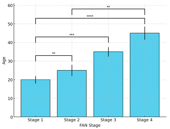 Variations in FAN stage according to age. **, p < 0.01; ***, p < 0.001; ****, p < 0.0001.