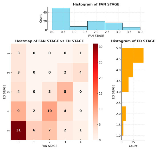 A statistically significant negative relationship was observed between the FAN stages and IIEF scores. Higher FAN stages, reflecting more severe FAN, correlated with lower IIEF scores, reflecting more severe ED (rho = −0.631; p = 0.001).