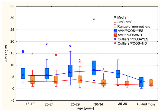 In women, AMH levels decline with age and become undetectable after menopause. It is assumed that peak levels of this hormone are reached by women between the ages of 21 and 30, on average, at 24.5 years of age [5]. During reproductive age, patients with PCOS have approximately two to three times higher serum AMH levels compared to individuals without the condition [5,6]. This is particularly significant for women with polycystic ovary syndrome who are unsuccessfully trying to conceive.