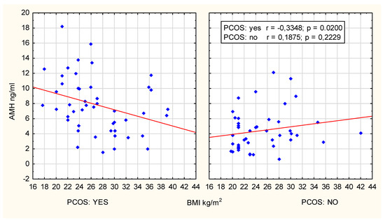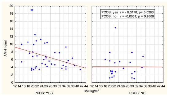 After dividing the patients into age categories, a correlation analysis was conducted between AMH concentration and BMI in different groups of women with PCOS. In the case of women in the 18–19 age group, no correlation was observed between AMH and BMI (r = 0.0224; p = 0.8685). In the 20–24 age group, a negative correlation between these parameters was identified (r = −0.3170, p = 0.036). These data are graphically presented in Figure 2.