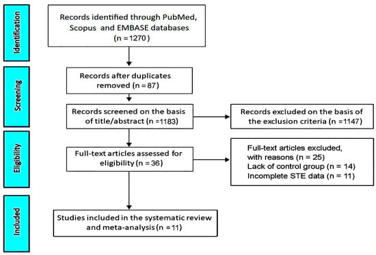 The initial research performed in PubMed, Scopus and Embase databases gave rise to 1270 studies that evaluated cardiac function in MASLD patients. 87 studies (6.8%) were removed as duplicates. 1147 studies (90.3%) were excluded on the basis of the exclusion criteria. The remaining 36 studies (2.8%) were assessed for eligibility. Of these, 14 (1.1%) were excluded due to the lack of a control group of non-MASLD individuals and 11 (0.9%) due to incomplete STE data. Accordingly, 11 studies (0.9%) [22,23,24,25,26,27,28,29,30,31,32] were included in this systematic review and meta-analysis, totaling 1348 MASLD patients and 6098 healthy controls without MASLD (Figure 1).