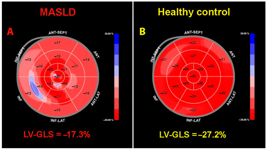 Figure 2 depicts two representative examples of LV-GLS bull’s eye plot obtained by STE in an individual with MASLD (A) and in a healthy control (B).