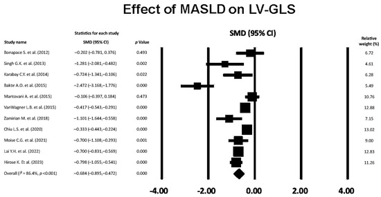The forest plot showing the effect of MASLD on LV-GLS, assessed by the included studies, is illustrated in Figure 3.