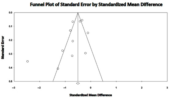 Sensitivity analysis confirmed the robustness of the study results. The omission of each study caused a mild variability in SMD, from −0.671 (95% CI −0.898, −0.444, p < 0.001) to −1.156 (95% CI −2.129, −0.183, p = 0.02).