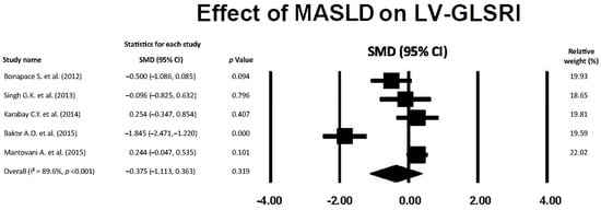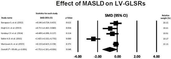 The overall SMD of LV-GLSRs was −0.753 (95% CI −1.501, −0.006, p = 0.048), indicating a medium effect of MASLD on LV-GLSRs magnitude. The overall I2 statistic value was 89.4%, compatible with substantial between-study heterogeneity. Egger’s test gave a p value equal to 0.26, thus excluding publication bias.